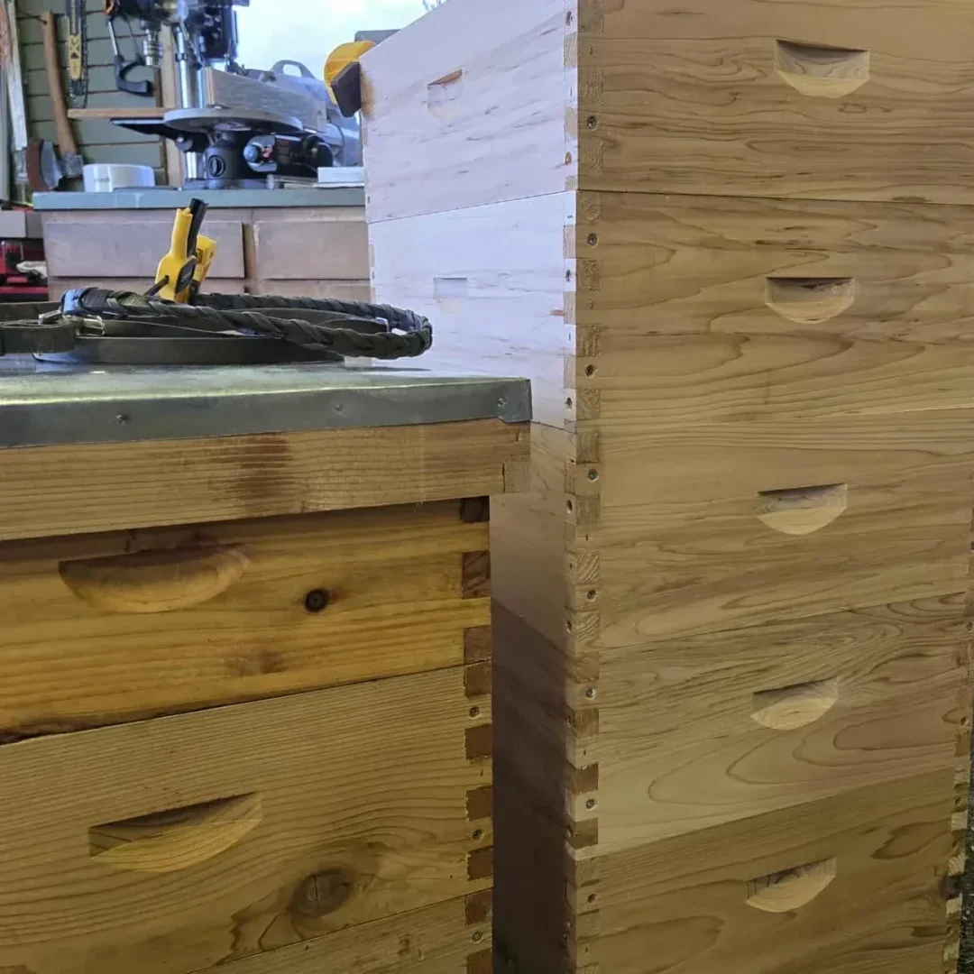 Most of our honey boxes, super, bottom board, and lids are made from Western Red Cedar grown on the farm. The logs are mostly fallen by storms and some from thing. We cut the logs into boards with a portable band saw mill, then stack to let dry. Once air dried for a few months to a year we clean up the boards and make bee equipment with them.